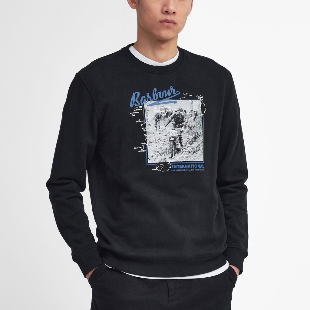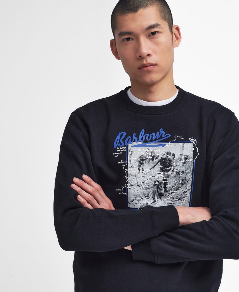 Щампата върху този суичър е снимка от частния архив на семейство Barbour от Международните шестдневни изпитания. Освен това, суитчърът е изработен от чист памук с характерно покритие Brushback Fleece (типичен удебелен завършек на суичъри) в удобна класическа кройка.