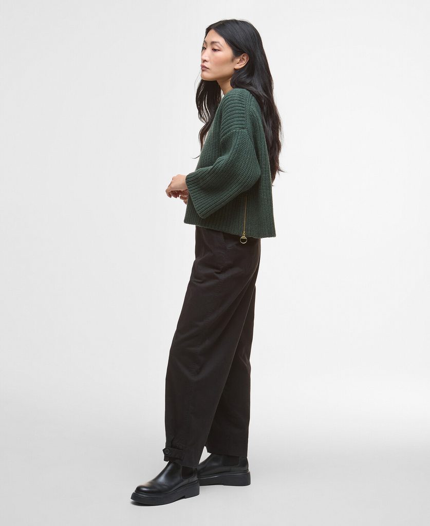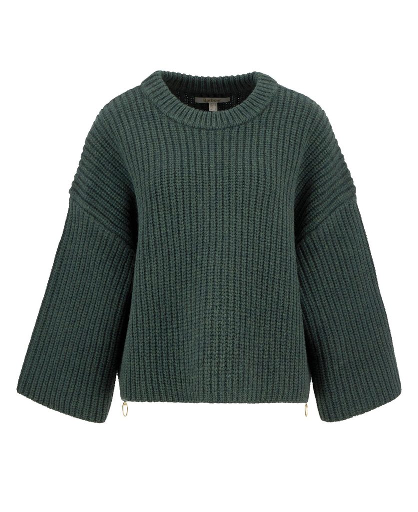 Дамски пуловер, изработен от вълнена смес, който е красив отдалеч и отблизо. Отдалеч е класически пуловер с rib-knit плетка. Отблизо - особено когато е носен - ще оцените удобните спуснати рамене, водещи до свободни ръкави, кръгло деколте и чифт ципове отстрани, с които можете да разхлабите още малко и без това свободната кройка.