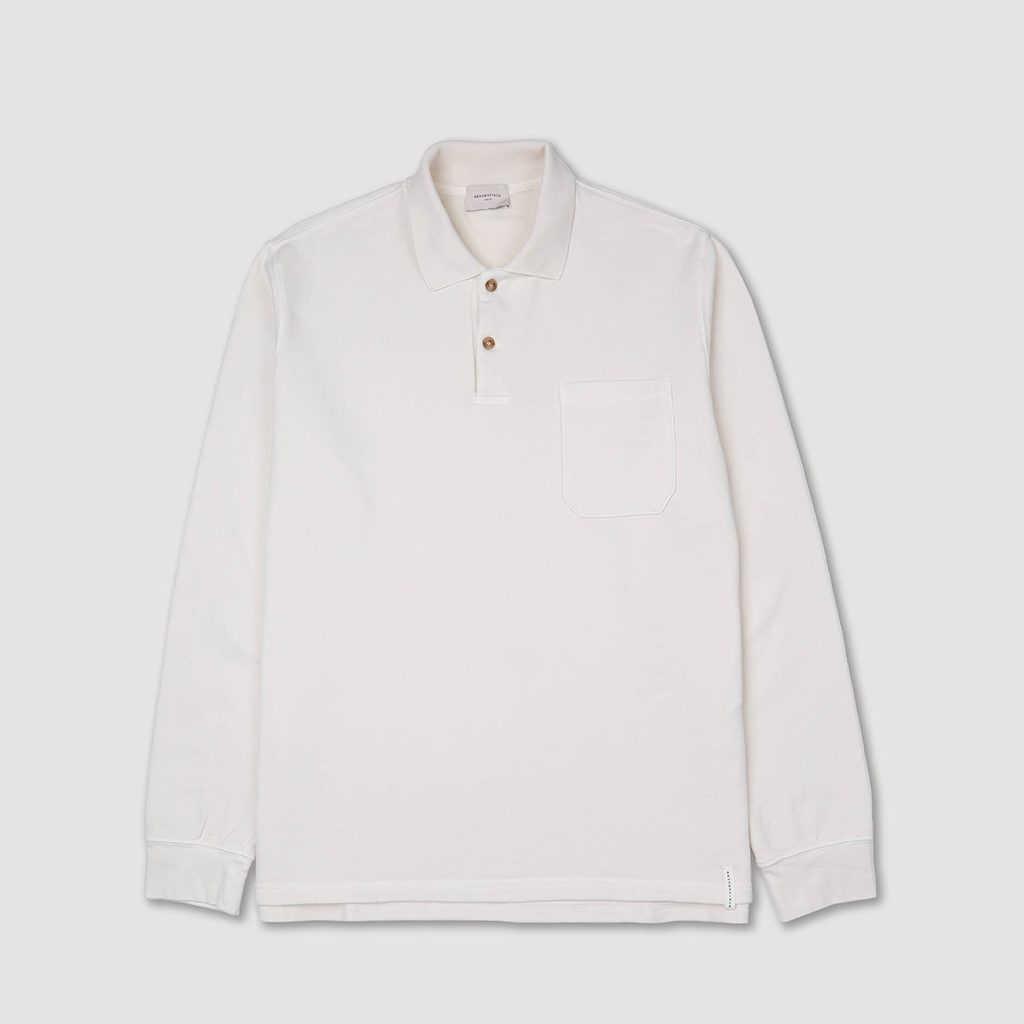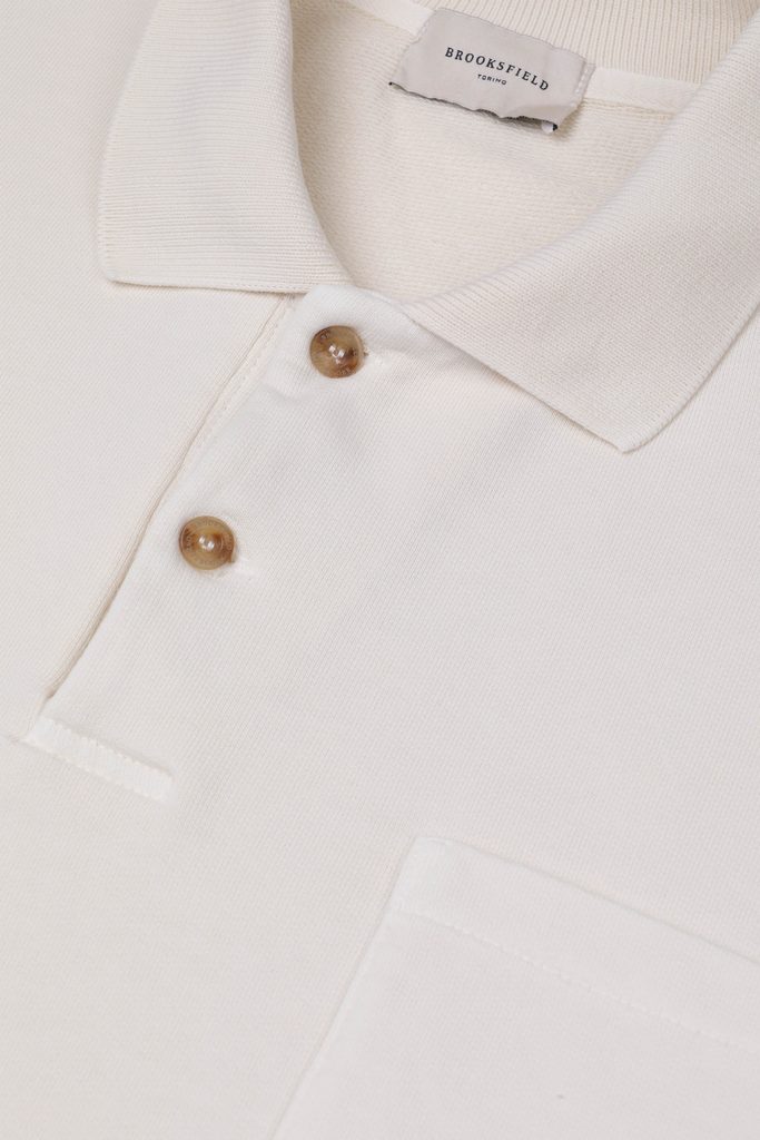 Пристрастяващо удобен италиански поло суитшърт в почти бял цвят. Така че можете да очаквате смесица от това, което познавате от поло ризите – две копчета за закопчаване и яка на ризата, изработена от по-мека еластична материя – и от суитшъртите – по-плътен памук с комфортна текстура от вътрешната страна на дрехата, стегнати маншети и подгъв.