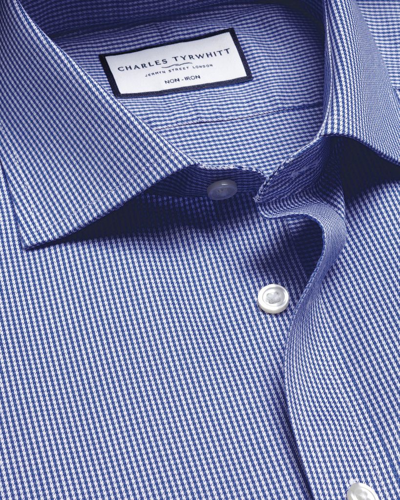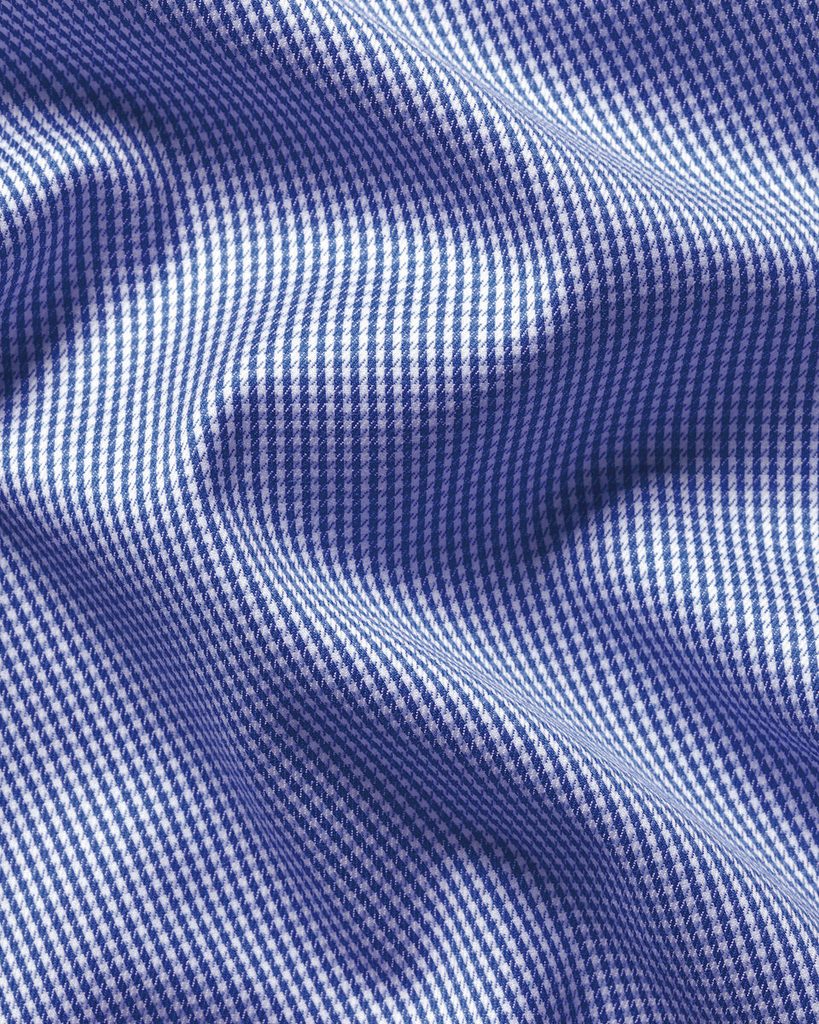 Официална риза с нотка модерен стил. Разширената яка, т.е. отворената яка, с която е оборудвана ризата, набира все по-голяма популярност. Самата риза е изработена от кепър в светло синьо (ситният модел puppytooth е черешката на тортата) от 100% памук. Освен това има покритие, което не се глади, така че няма повече сутрешни бързания.