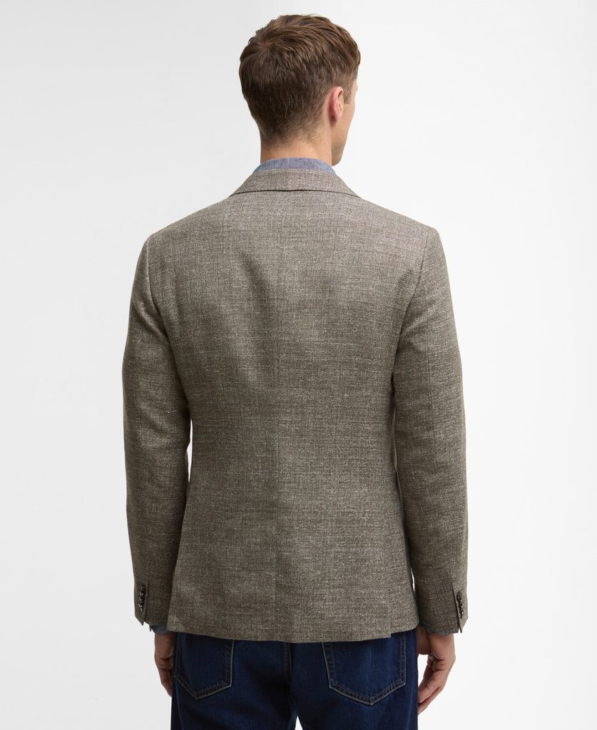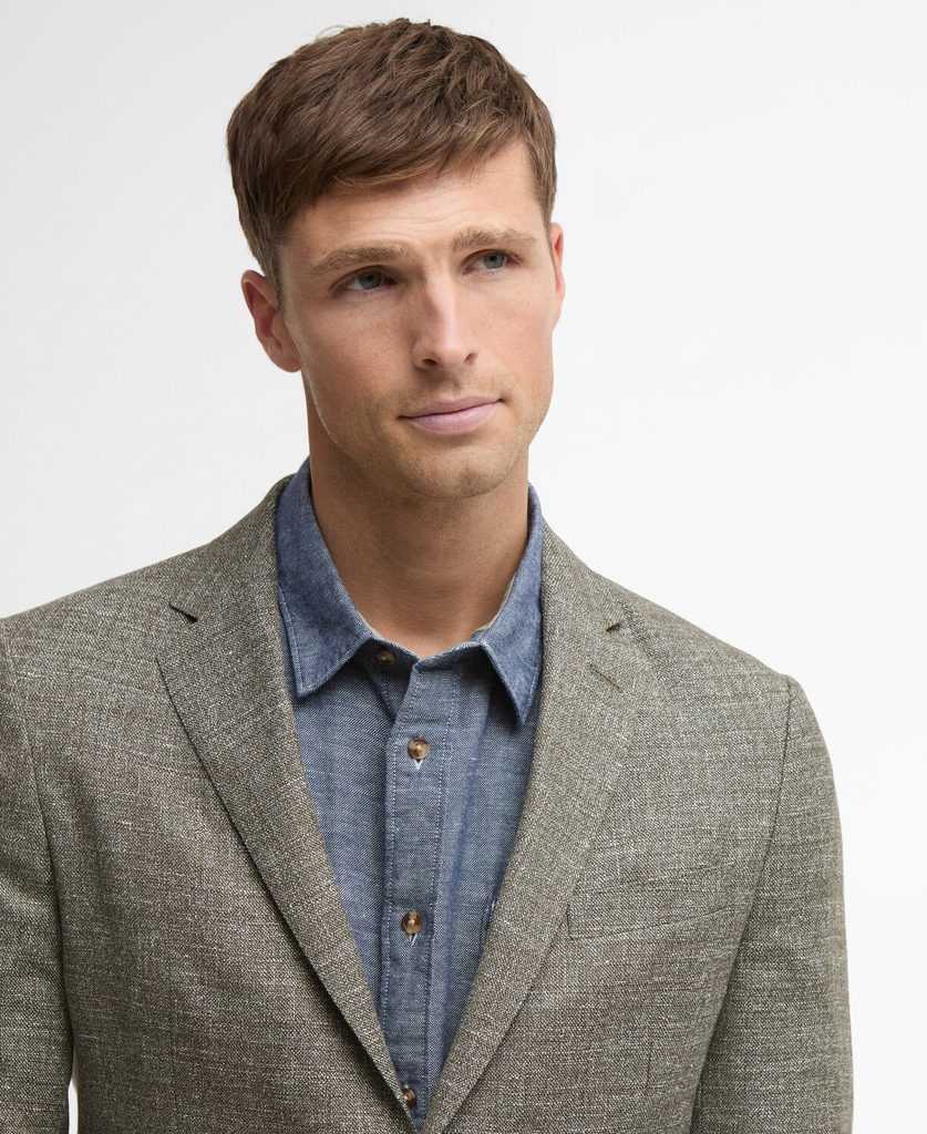 Неструктурирано сако от смес от вълна и лен, което стои изключително добре. Леко вталената кройка (типичният Barbour tailored fit) следва линията на тялото, но благодарение на меките рамене – оттам и „неструктурирано“ – не ограничава движенията и най-вече изглежда непринудено. Меланжовият му ефект придава по-малко формален вид, но въпреки това си остава истинско сако, с едноредно закопчаване с два копчета – макар че бихме го препоръчали по-скоро с дънки, отколкото с вратовръзка.