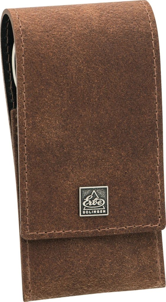 Този комплект за маникюр се предлага в закопчаващ се калъф от качествена естествена кожа.