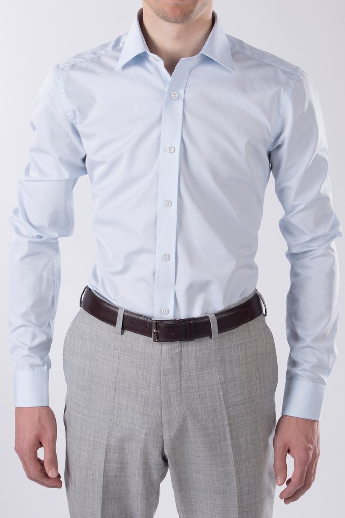 Поетична светлосиня риза - абсолютна необходимост за всеки гардероб. 100% памук, маншети с копчета и класическа яка.