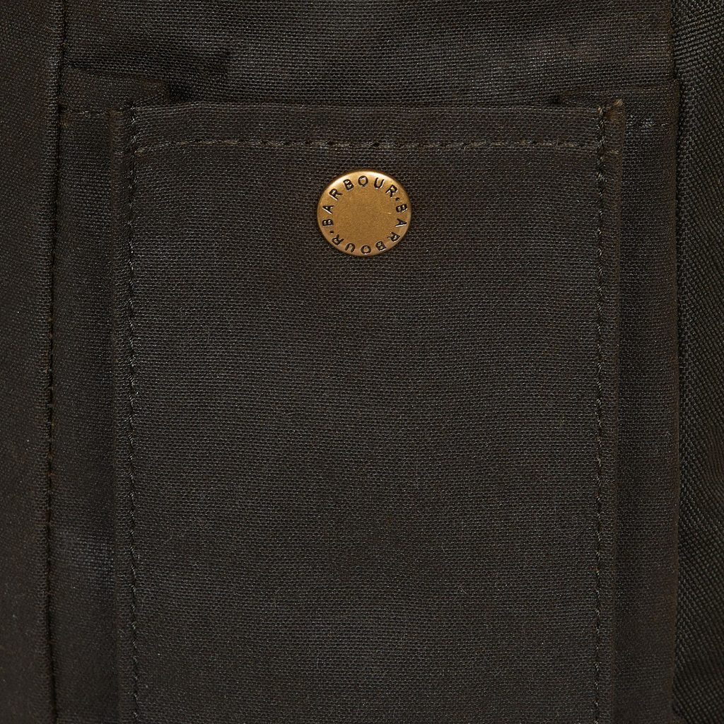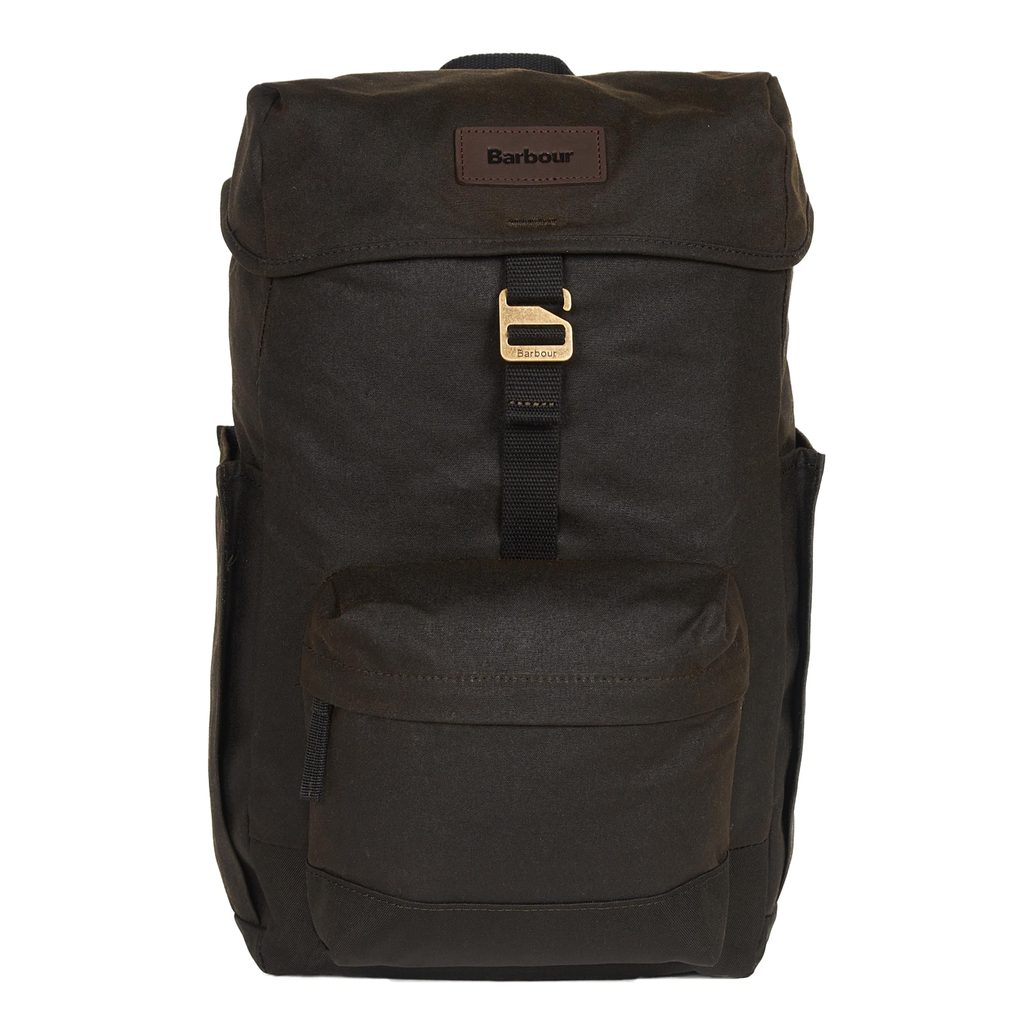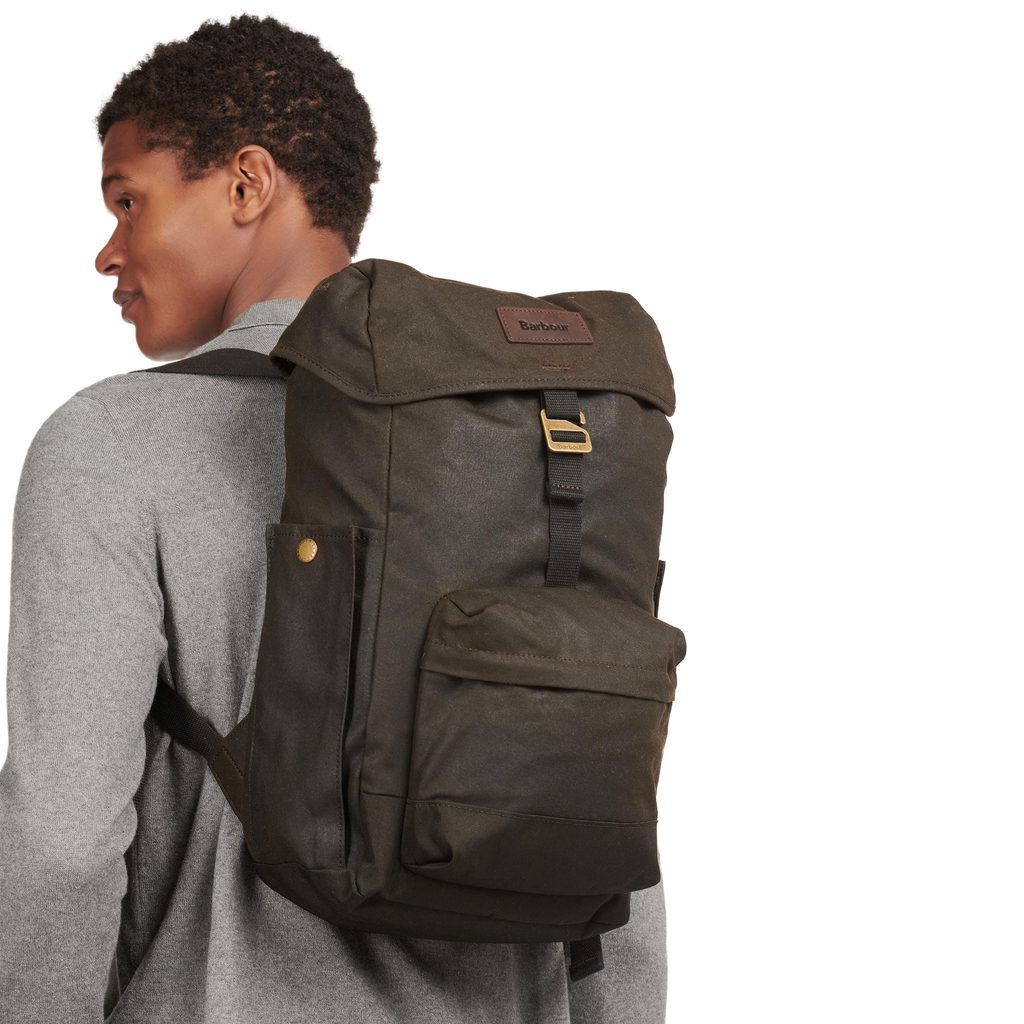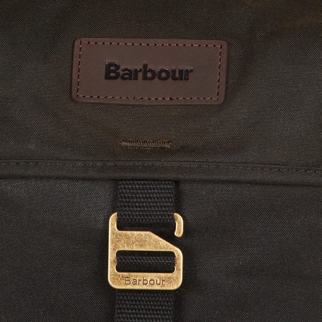 Класически барбур раница, ушита от восъчна памучна тъкан. Класическо подреждане с основен вътрешен джоб, затварящ на шнур и прегъващо затваряне на ключалка, един по-малък джоб и два бързи достъпни странични джоба.