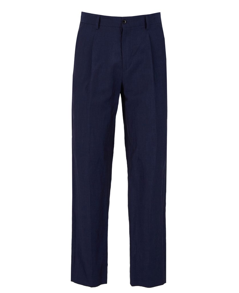 Панталони, които най-добре ще носите като долна част към сако в същия стил. Използваната смес от вълна и лен е материал, който се носи приятно дори през по-топлите месеци и същевременно запазва сравнително добре структурата си, ако сутрин отделите няколко минути за леко изглаждане. Кройката е стеснена с елегантни плисета, а панталоните разполагат и с очакваните два чифта джобове, включително задни джобове тип „паспол“. За тези, които търсят летен костюм, това е добро решение.