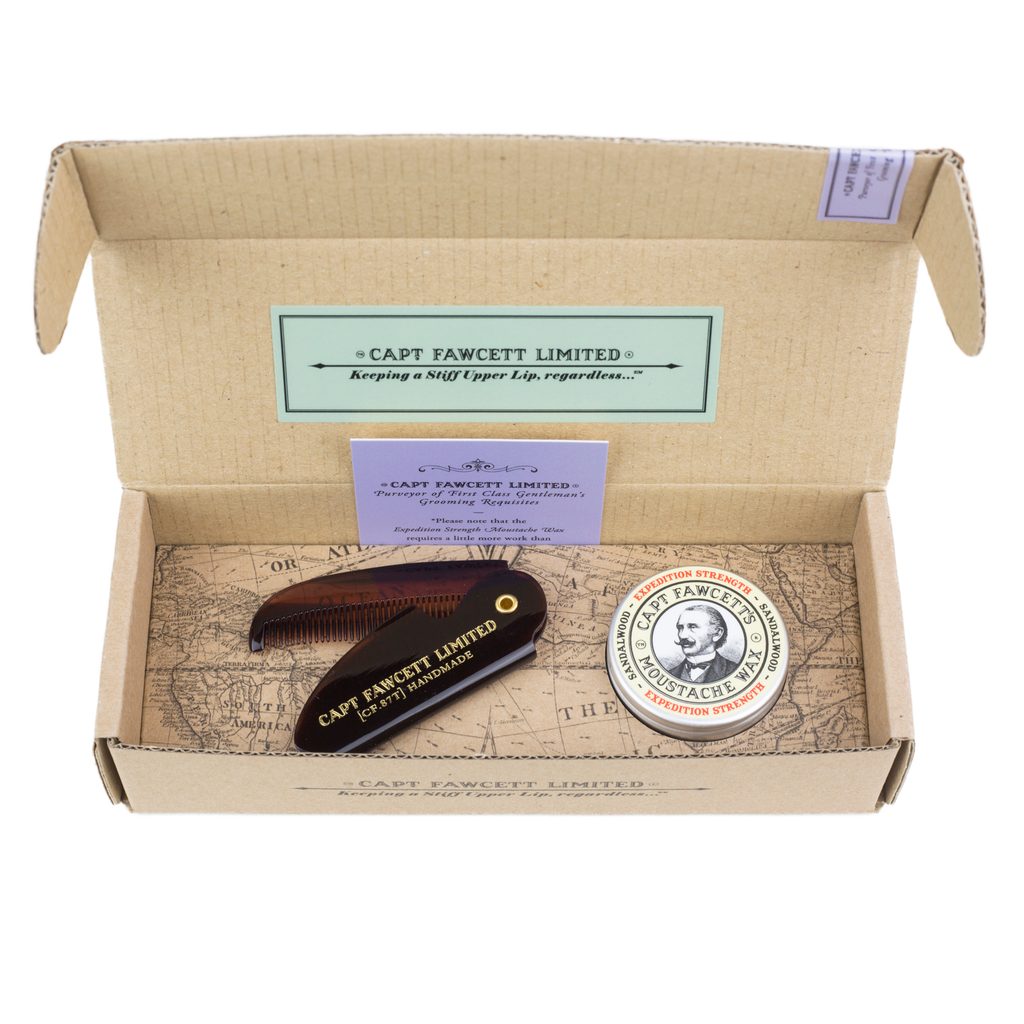 Капитанът беше известен с две неща. С мустаците, смелостта и брадата. Значи всъщност са три. Ето защо в този комплект не липсва сгъваем джобен гребен, с който можете да се справяте с поддръжката на мустаците си по всяко време.