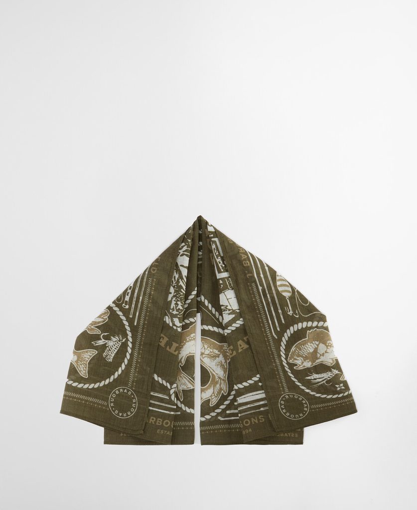 Памучен шал, т.е. бандана, с мотиви от архива на Barbour. Това означава мухи за риболов, ципове, копчета тип тик-так, риби, както и восък Barbour. Всеки цветов вариант има собствен дизайн, така че пролетната колекционерска страст е повече от ясна.