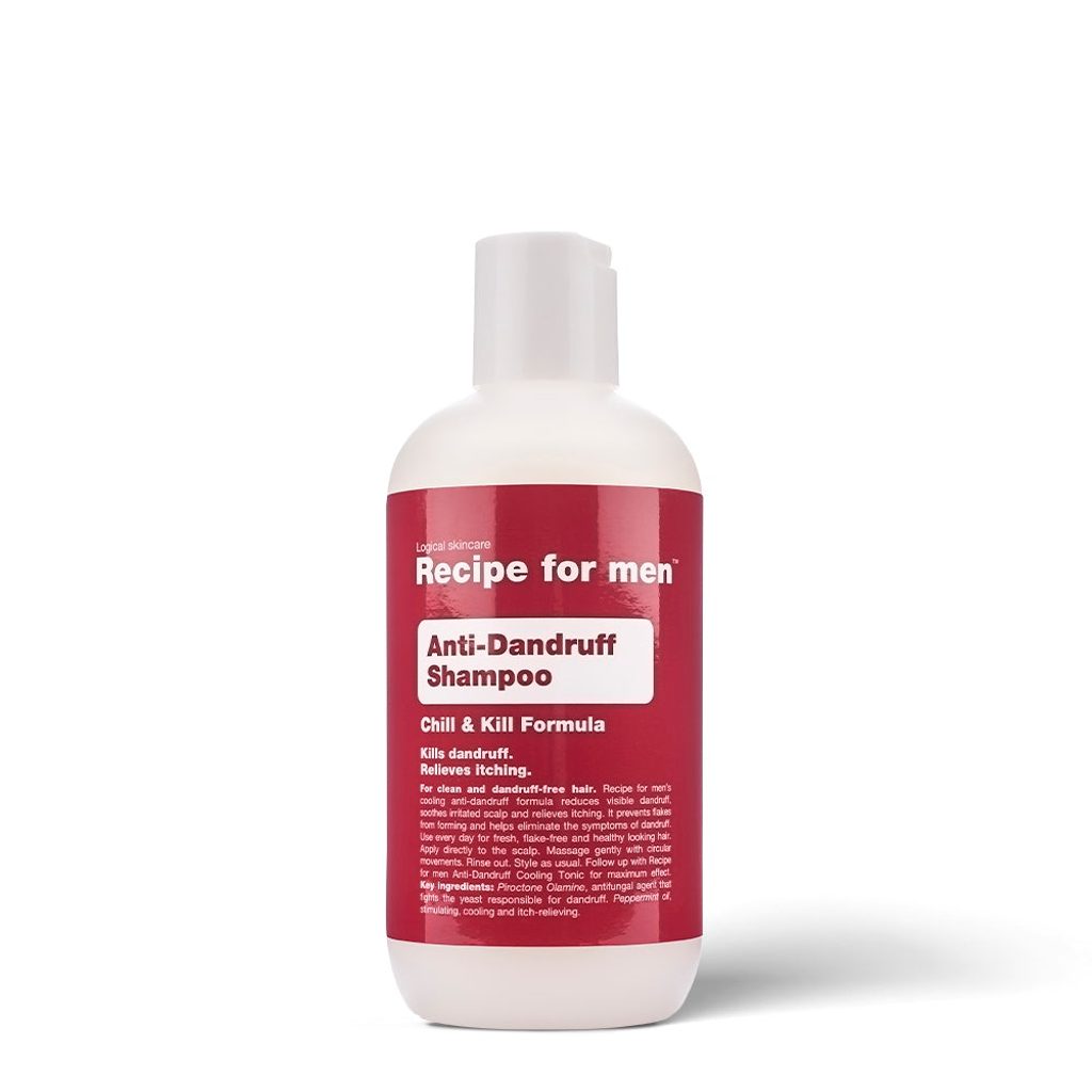 Нежен шампоан Recipe for Men, със който човек може лесно и бързо да реши проблема с лупа и едновременно да успокои раздразнена кожа на главата. Освен друго той съдържа освежаващо масло от пиперна мента.