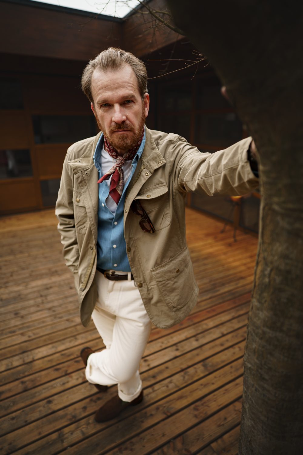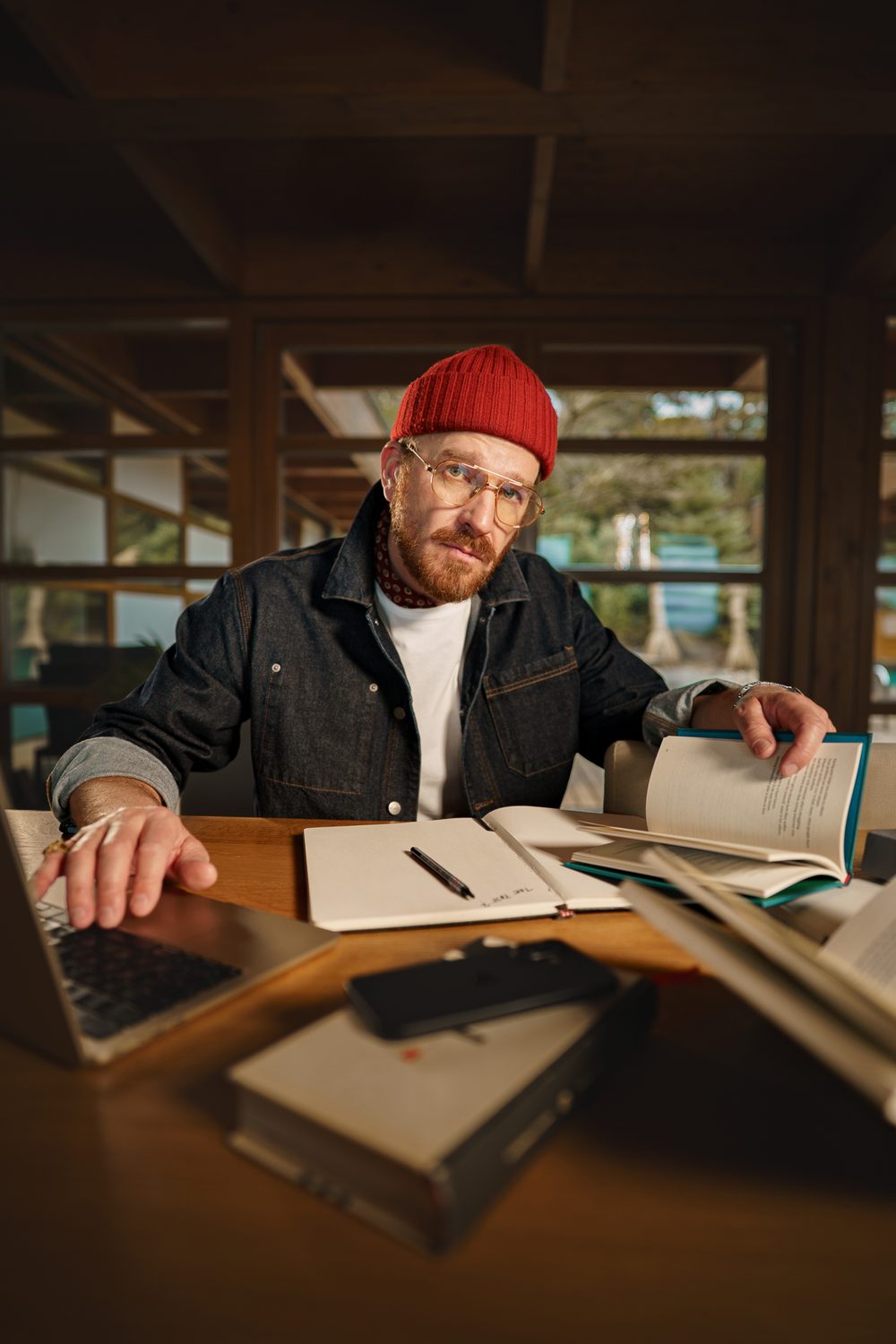 Отвъд града. Бетон, стъкло и дърво – суровата геометрия на пространството, която меката светлина на ранната вечер претворява в картина. Водата в езерото дори не помръдва, въздухът мирише на дърва и дим от цигара, която бавно догаря на ръба на пепелника.