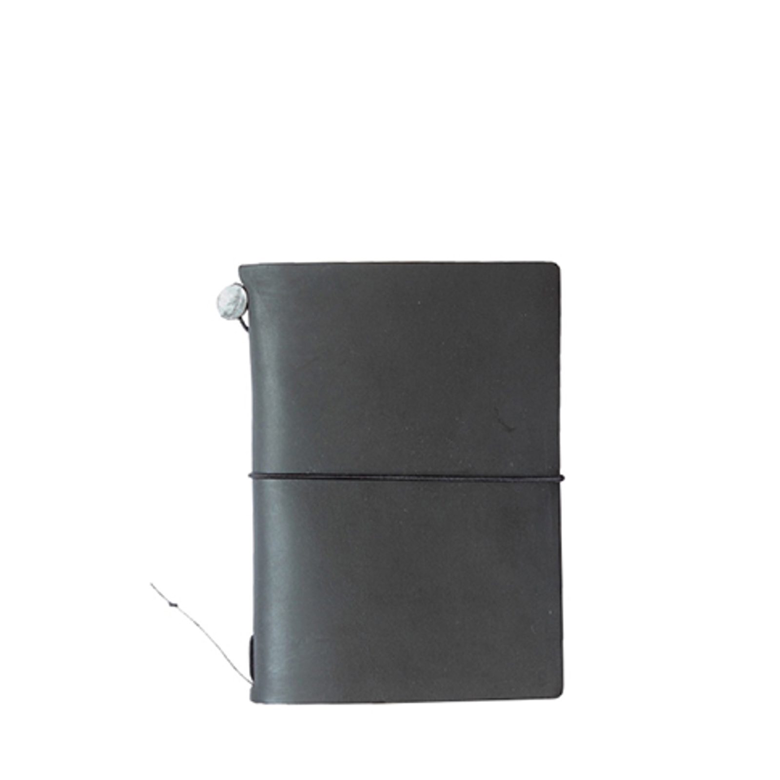 Тефтер на пътешественика Traveler's Notebook с на половина по-малък размер, с черни корици и голям характер.